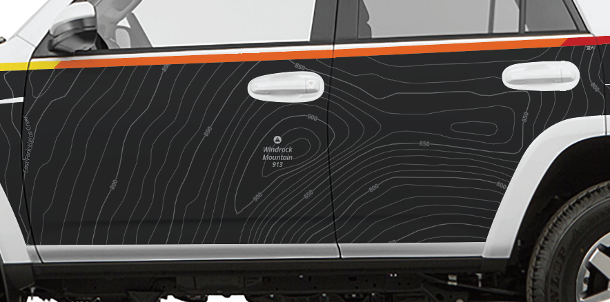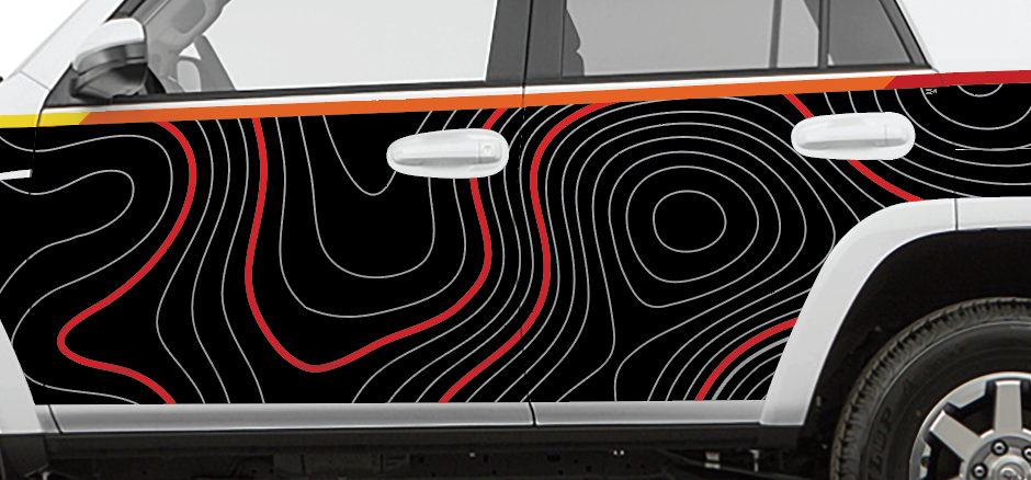 Start with your border selection, aggressive red, slate black, or tactical gray. Fill the core with a solid tone or one of our signature topo overlays. Want to take it to the next level? Add the textured gloss layer for an effect that shifts with the sunlight.